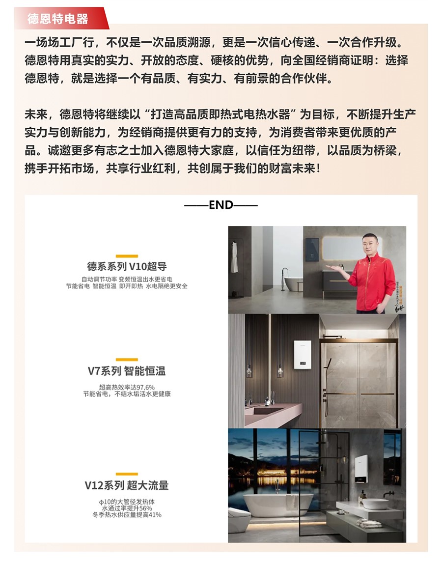 德恩特品牌旗下涵蓋即熱式電熱水器,速熱式電熱水器,快熱式電熱水器品牌和凈水機(jī)等